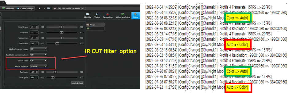 [ Camera system log_Automatic change ] [ Genetec: VMS IR Cut filter option ]