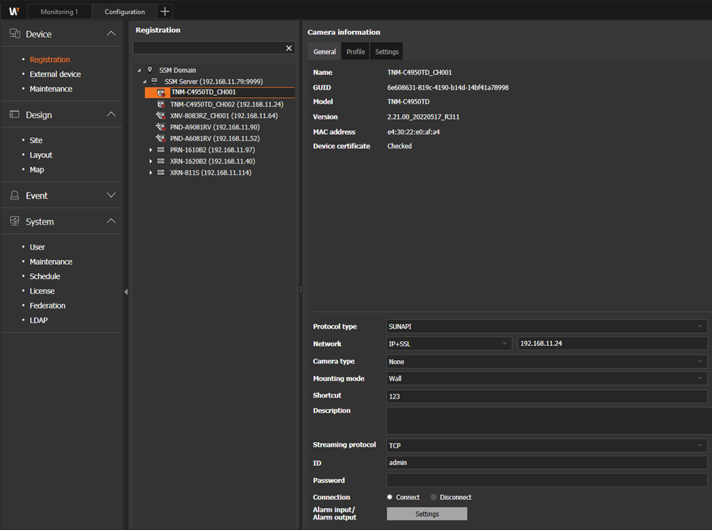 2. Go to [Configuration] Tab -> [Device] -> [Registration] and select a camera.