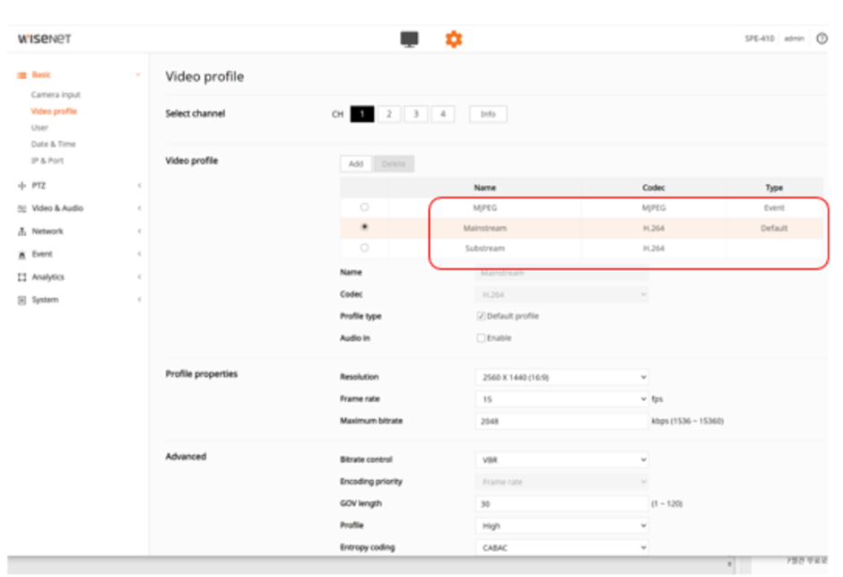 1. Go to Encoder’s Webviewer(Setting > Basic > Video Profile), remove(delete) all profiles automatically created by WAVE and decoder except the default three profiles as below(MJPEG, Mainstream, Substream)