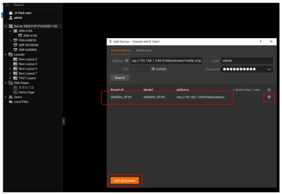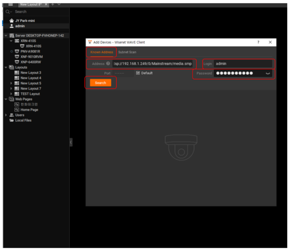 - Enter “rtsp” SUNAPI command in the “Address” section