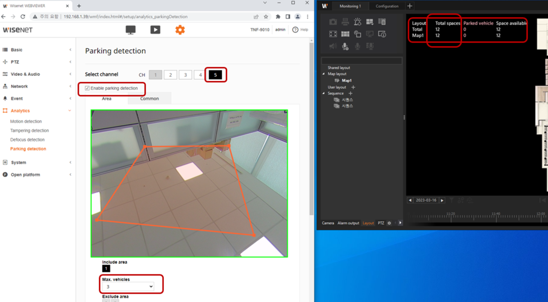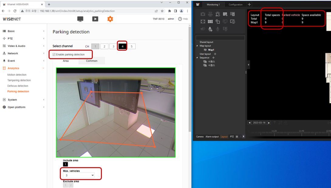 Check Enable parking detection for a CH and set the Maximum vehicle for the area as below left image.