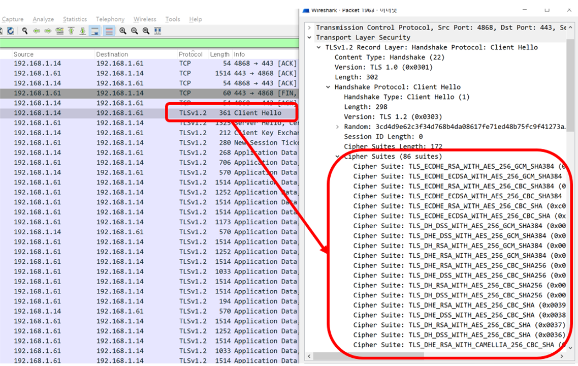 - “Client Hello” packet shows all the supported cipher suites