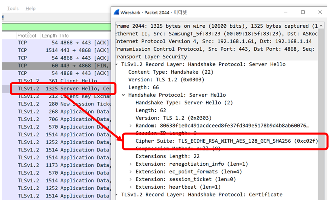 - “Server Hello” packet shows which of the cipher suite has been negotiated