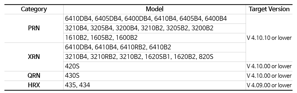 The products below need to be checked with the guide details if they are to proceed with the software update to versions higher than indicated.