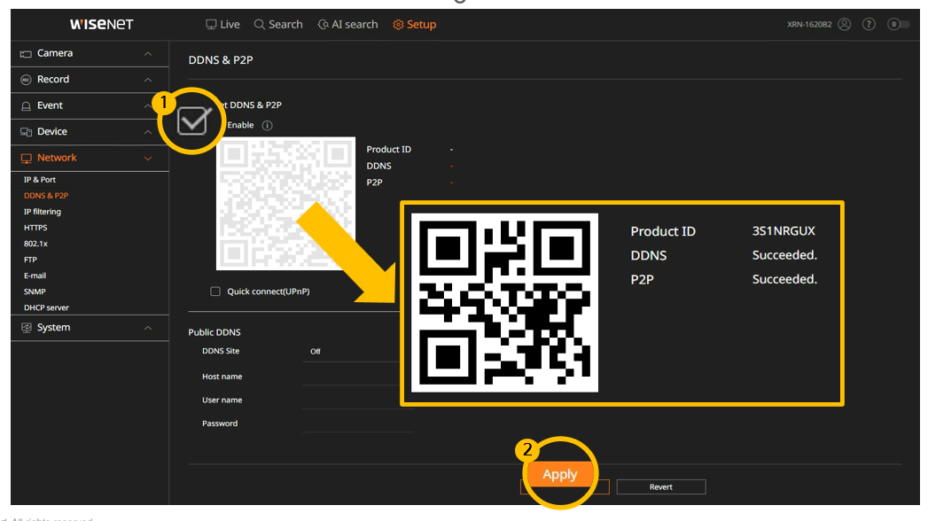 - In the [Setup] > [Network] > [DDNS&P2P] menu of the device, select [Enable]. The QR code is activated.