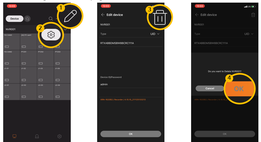 - Remove only NVR to register as a new QR code from the list. (Devices where the current QR code is maintained are not to be deleted.)