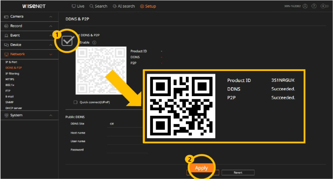 b. [Setup] > [Network] > [DDNS/P2P] > [Enable] to activate QR code