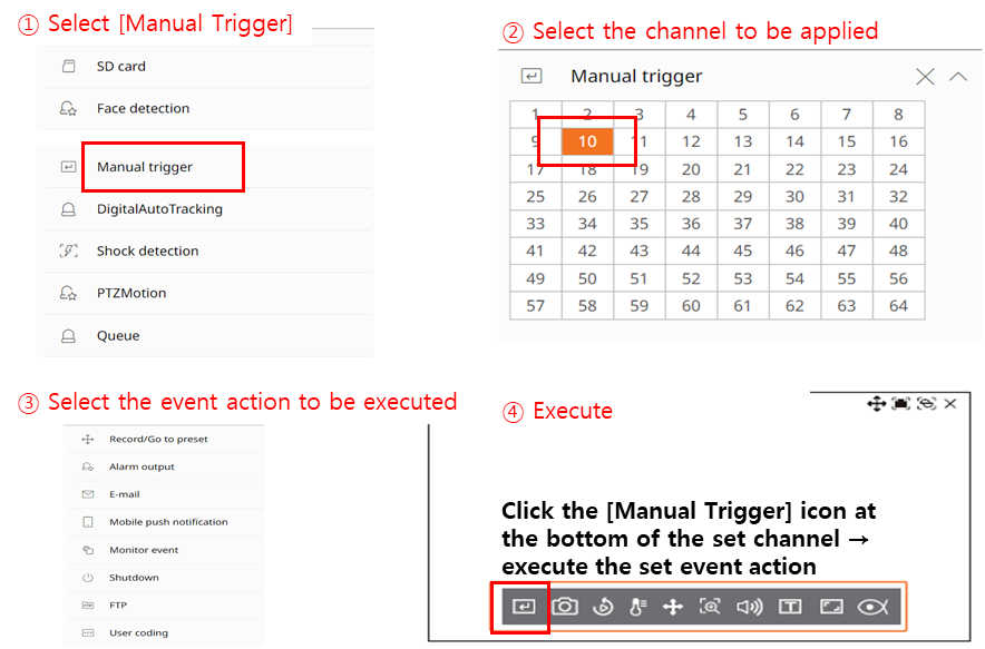 - User Coding in the event action options, is a function used for setting the SUNAPI command that you want to send to the camera and for making the camera operate according to the set SUNAPI command when the [Manual Trigger] button is clicked.