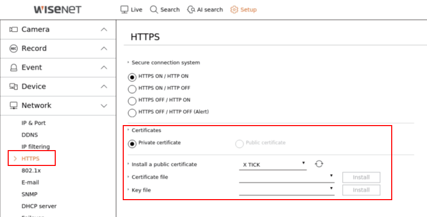 - If the “Private Certificate” option is selected, secure connection will be made using the self-certificate provided by the storage device..