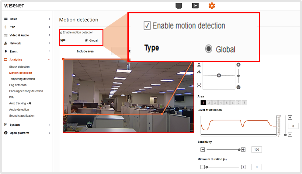 > Motion Detection/IVA > Check the ‘Enable Motion Detection/IVA’ option