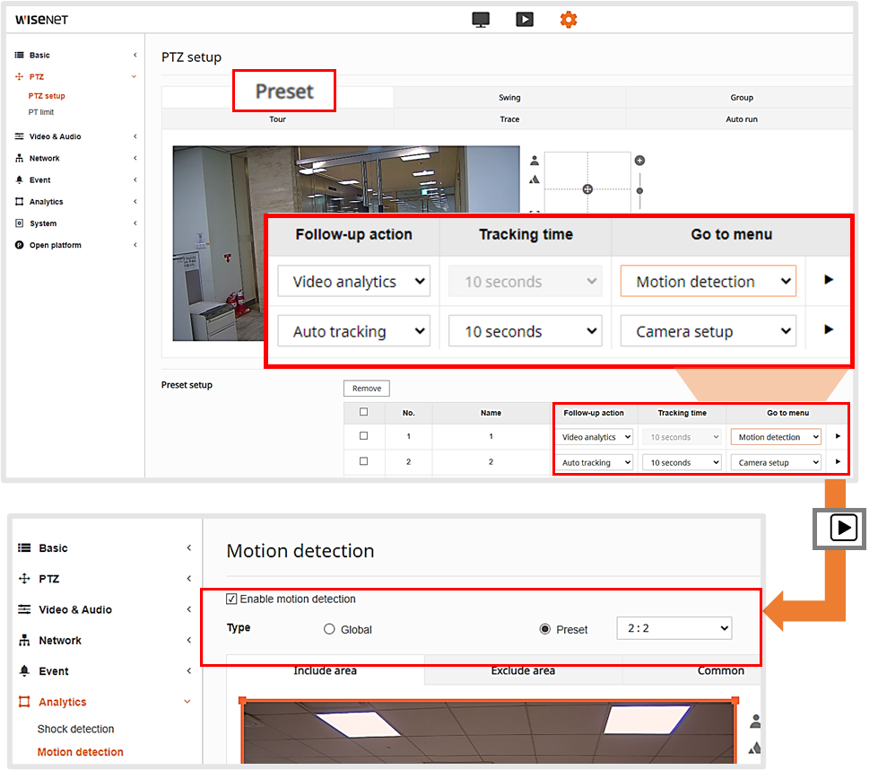 - To guide you through setting for analysis(Motion Detection/IVA) of PTZ camera's normal screen and preset screen videos