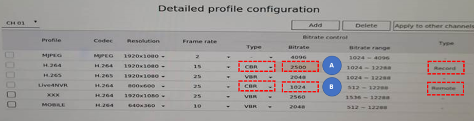 . Camera’s bitrate is approximately the sum of A(Record profile Bitrate)+ B(Remote profile Bitrate)