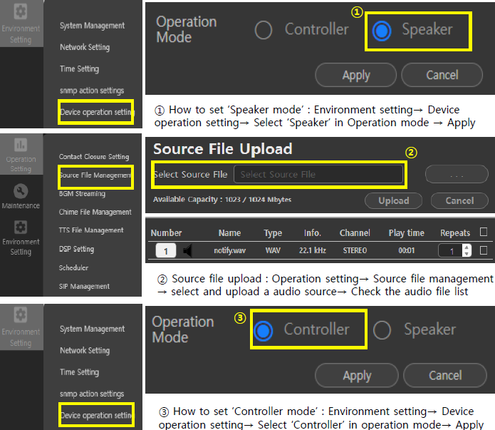 ① Set as ‘Speaker mode’(default) default)→ ② Upload audio source file → ③ Set as ‘controller