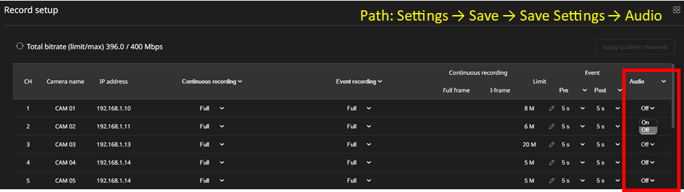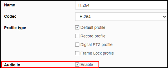 - Rebooting the system after changing the camera setting to use audio (enabling the 'Audio in' option in the profile)