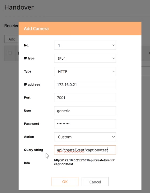 * Send the http command using the camera's [Handover] and [Event rule] functions.