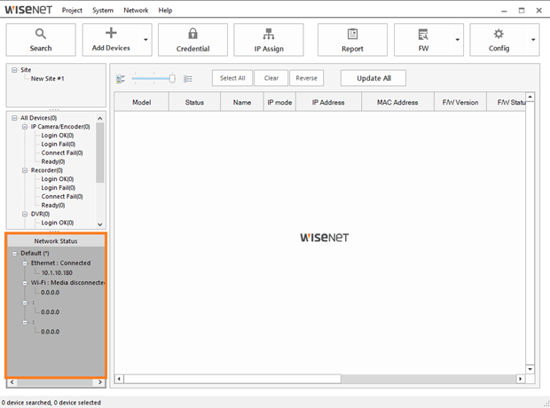Wisenet Device Manager (version 2.1.x or higher) can be configured to search a specific network connection when running a network scan.