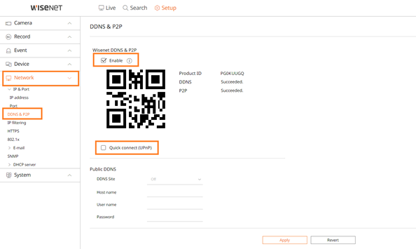 You can test the DDNS connection by entering the following into a browser on a device, not on the client's network : https://ddns.hanwha-security.com/<Product ID>