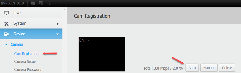 Login to NVR and navigate to DEVICE > Camera > Camera Registration.