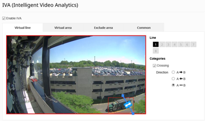 - Enable IVA, in the example "Line Crossing" line crossing is used