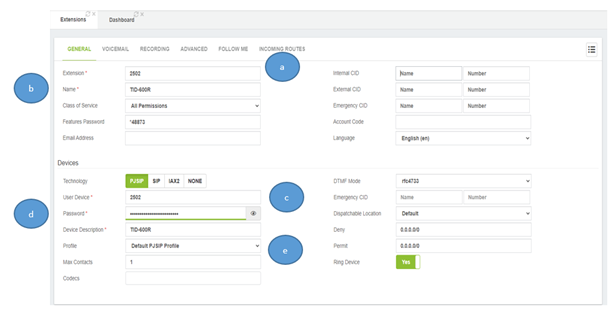 b) Extension name (This can be as simple as the location of the TID-600R in the site)