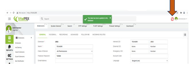 In order for the save action to take effect, you may need to reload the PBX configuration. Click the icon below
