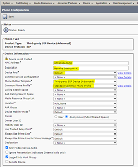 Device Security Profile: Third-Party SIP Device Advanced- Standard SIP Non-Secure Profile
