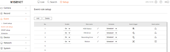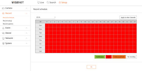 All Hanwha recorders ship with a continuous recording schedule assigned out of the box, if your site needs Event Recording, please follow the Step by Step below