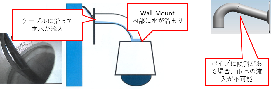 - Wall Mountの場合、パイプ内部に水の流入を防ぐためにパイプに傾斜がある。