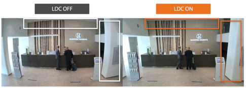 - Wisenet7は、広角レンズによって発生するイメージ歪曲(歪み)を補正します。新たなレンズ歪み補正 技術(LDC; Lens Distortion Correction)を適用したWisenet7ラインアップはイメージ歪みがひどくても これを直して人間の視野角に近い歪みのない映像を伝達します。