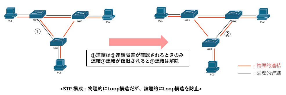 - Loop構造のネットワークで特定ポートを遮断状態に切替えて論理的にLoop構造を防止